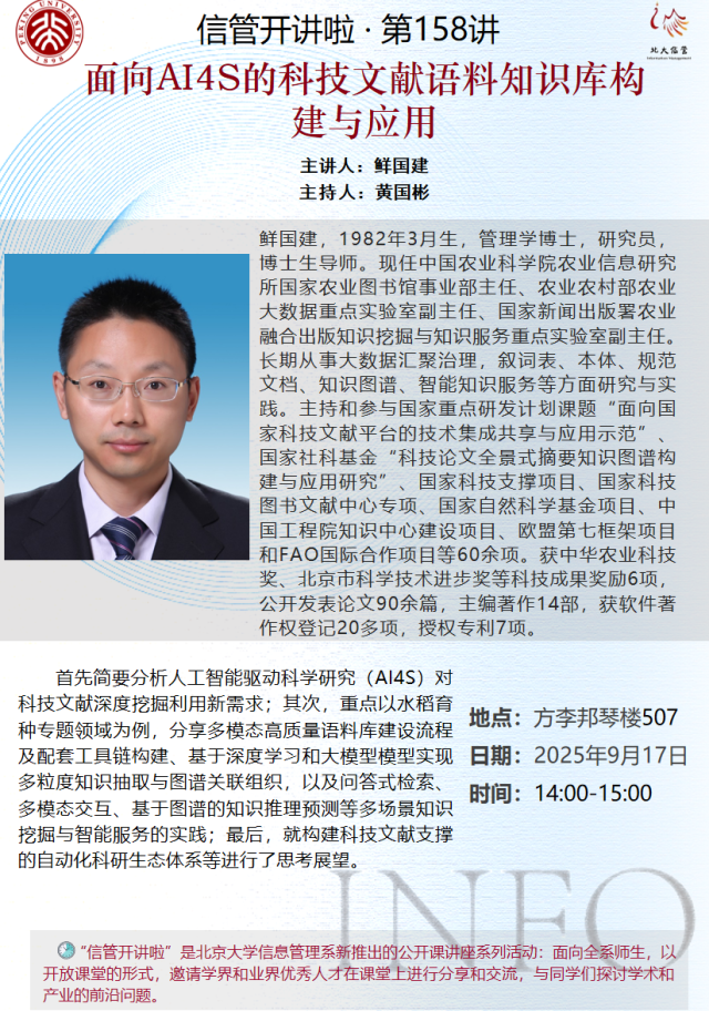 信管开讲啦·第158讲 | 面向AI4S的科技文献语料知识库构 建与应用